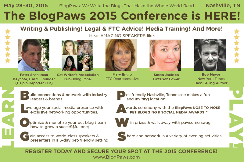 The BlogPaws 2015 Conference takes place May 28-30, 2015, at the Sheraton Music City Hotel in downtown Nashville. The conference is capped at 500 attendees for a more intimate, personal experience, culminating with a Red Carpet event to celebrate the pet industry’s only pet blogging awards judged by a distinguished panel of professionals, not by popular vote.
