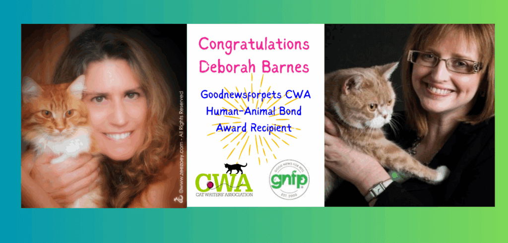 Since I last attended the AVMA conference this summer, fall has been filled with conferences, both online and in person. I am sad I was not able to make this year’s Cat Writers’ Association (CWA) conference in person due to yet another conflict, but I am thrilled to give a shout-out of congratulations to Deborah Barnes, the 2025 recipient of the Goodnewsforpets CWA Human-Animal Bond Award that we sponsor and that is announced each year by CWA.