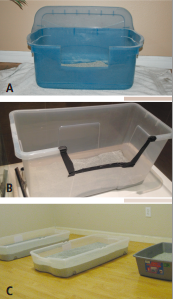In general, bigger is better and many commercial litter boxes are too small. Litter boxes should be 1.5 times the length of the cat from the nose to the base of the tail. Suitable alternatives can include concrete mixing trays or storage containers.You can place the lid behind the box to protect the wall (Photo A). Older cats need a low entry so you can cut down the side but inspect for any sharp edges (Photo B).