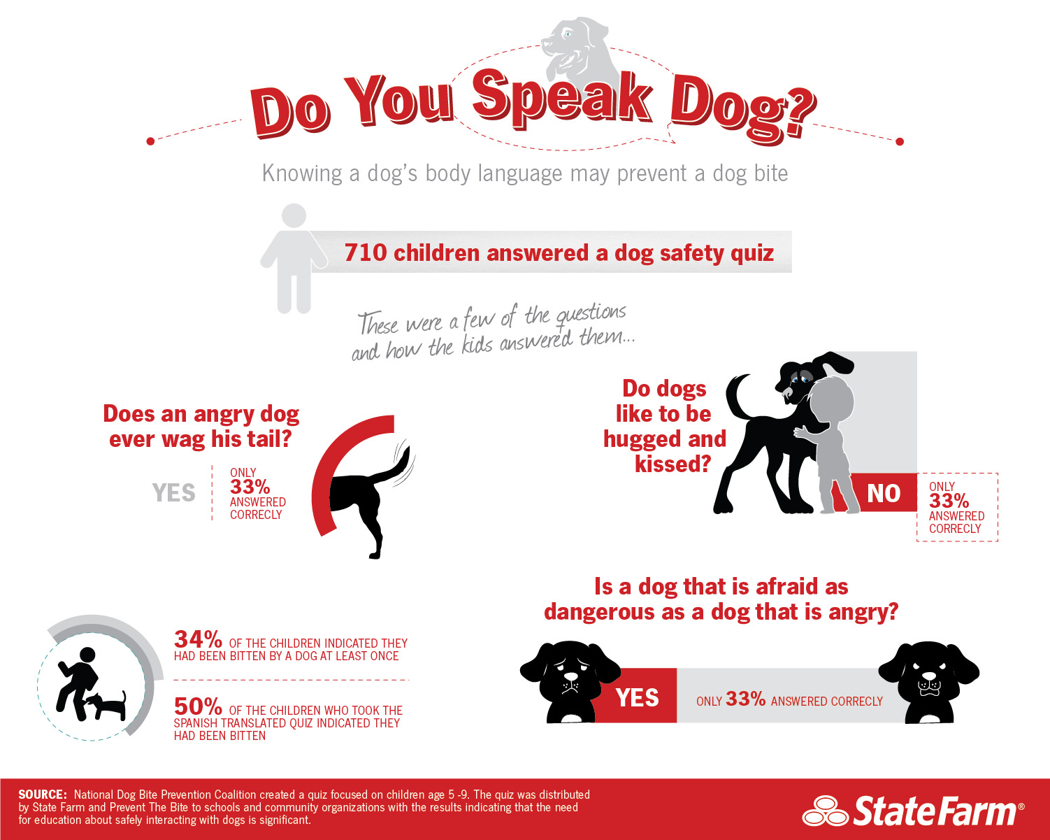 Children make up more than 50 percent of all dog-related injury victims. To better understand the level of knowledge about dog behavior among children, the National Dog Bite Prevention Coalition created a quiz focused on children age 5 -9. The quiz was distributed by State Farm and Prevent The Bite to schools and community organizations last month with the results indicating that the need for education about safely interacting with dogs is significant.