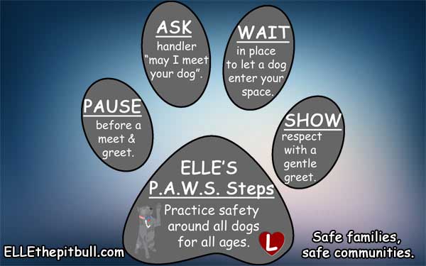 Greeting dogs respectfully can reduce the chance of a dog bite. Remember to PAWS – Pause, Ask, Wait, Show.