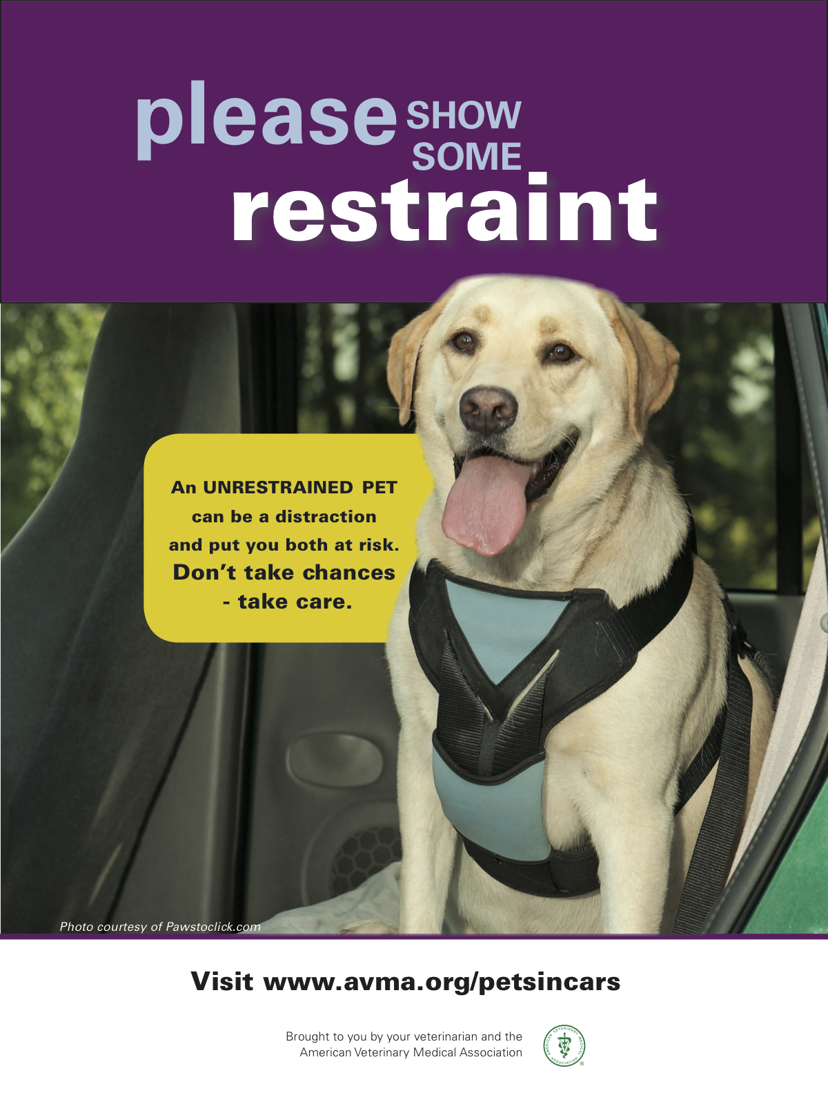 You restrain yourself in a vehicle, why shouldn’t you do the same for your pet! It’s not safe for your pet to sit in your lap or unrestrained while in a vehicle. Purchase a properly-sized safety harness or travel crate for their and your safety, cats can get under pedals and dogs can become frantic or distracting. Practice with your pet in their travel harness/crate prior to traveling.